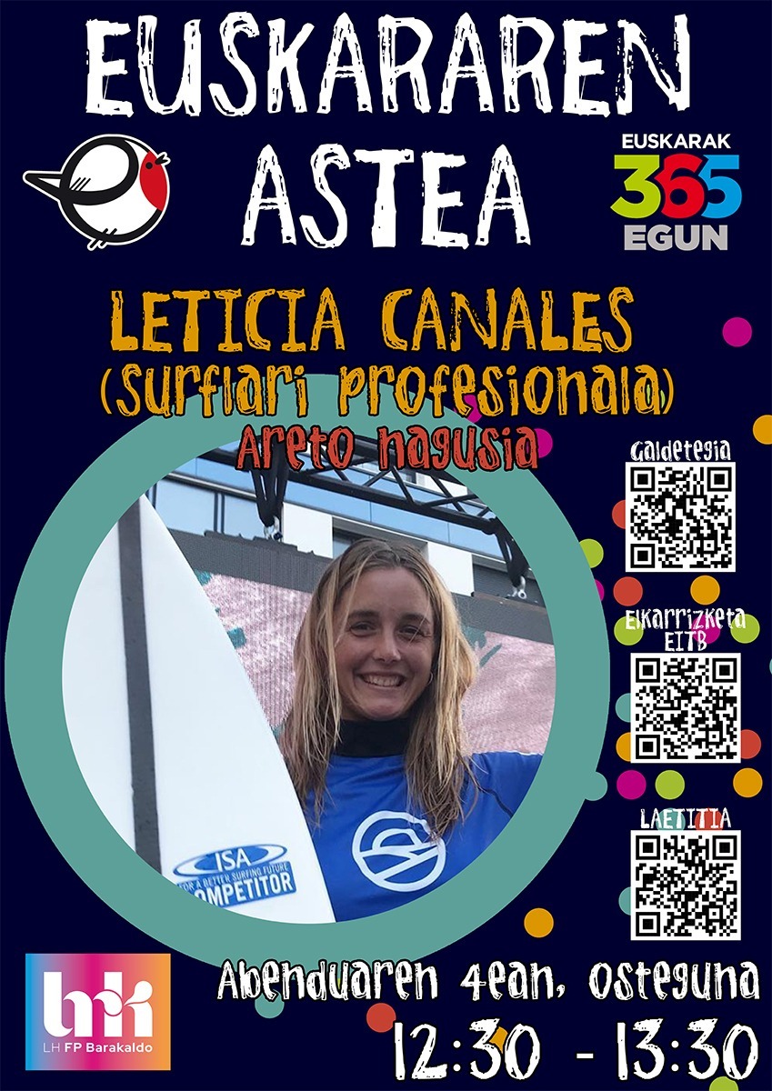 HITZALDIA: Leticia Canales, Surflari profesionala. Gobindatutako taldeez aparte (1HHE3D, 1HBU3D, 2HBU3D, 1EAS3A, 2EAS3A) parte hartzeko, galdetegi hau bete.