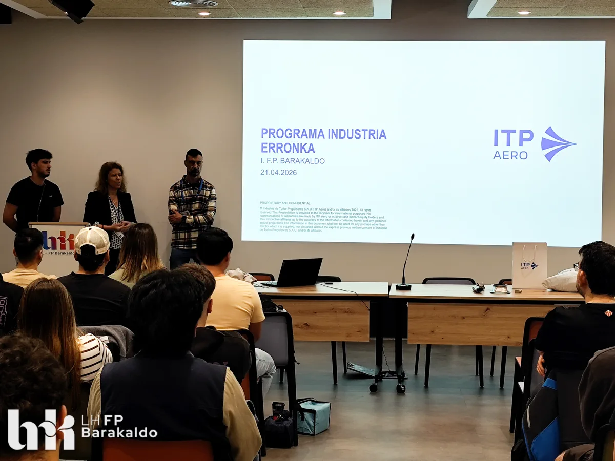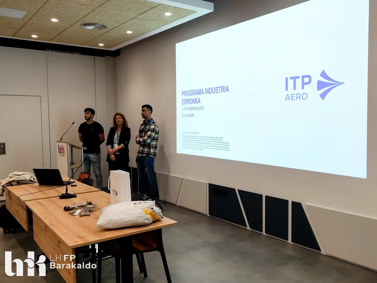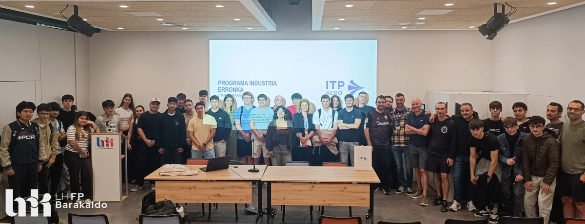 El pasado 21 de abril, el alumnado de los ciclos de Mecanizado, Programación de la producción y Diseño en fabricación mecánica de FP Barakaldo LH participó en un encuentro con la empresa ITP Externals, dentro del proyecto Industria Erronka, una iniciativa impulsada por la Federación Vizcaína de Empresas del Metal (FVEM) con el objetivo de acercar la realidad industrial al estudiantado de Bizkaia.