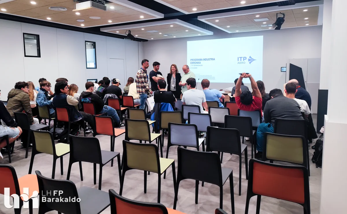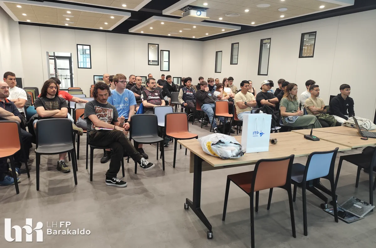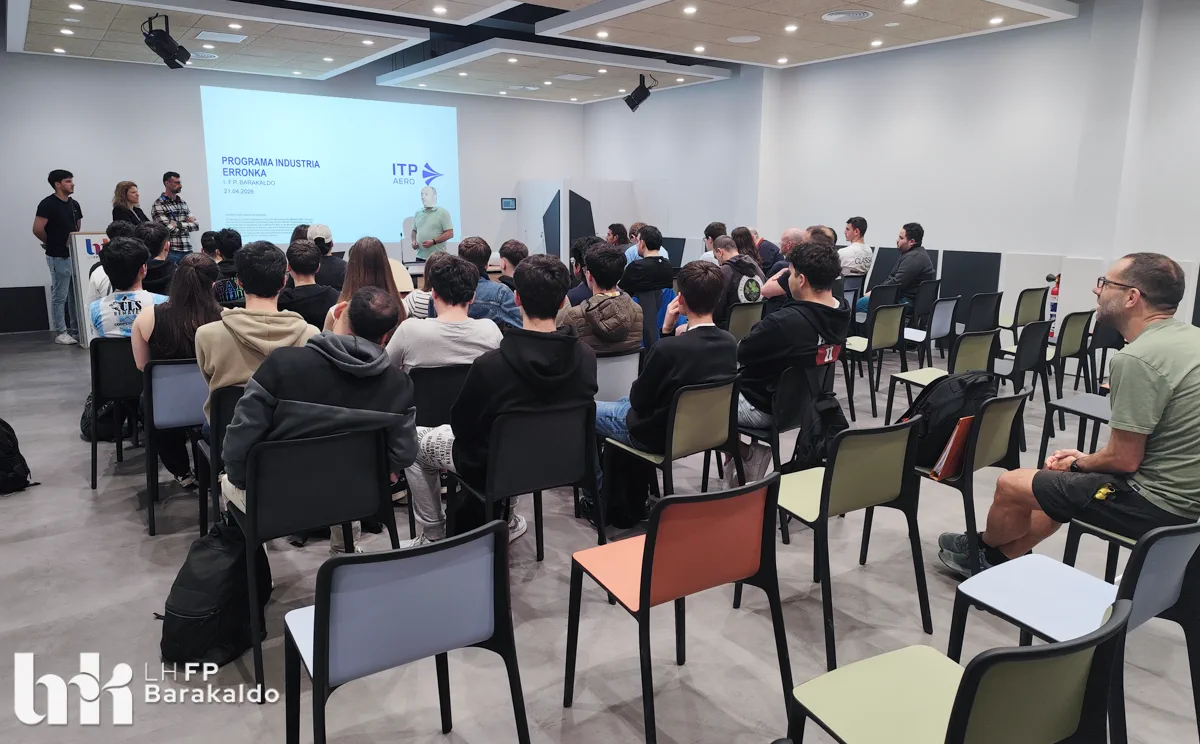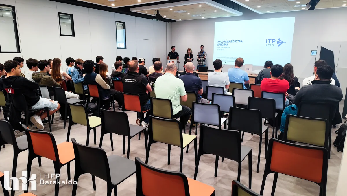 El pasado 21 de abril, el alumnado de los ciclos de Mecanizado, Programación de la producción y Diseño en fabricación mecánica de FP Barakaldo LH participó en un encuentro con la empresa ITP Externals, dentro del proyecto Industria Erronka, una iniciativa impulsada por la Federación Vizcaína de Empresas del Metal (FVEM) con el objetivo de acercar la realidad industrial al estudiantado de Bizkaia.