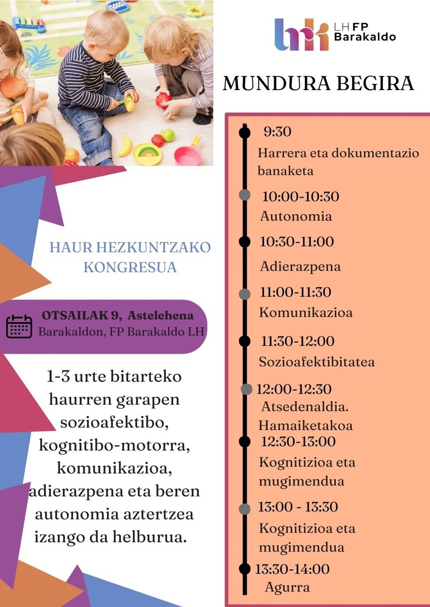 Kongresua, Munduari Begira lelopean, FP Barakaldo LHko areto nagusian egingo da, otsailaren 9an, 9:30etatik 14:00etara. Etorriko direnen artean, besteak beste, CIFP Fadura LHIIko Haur Hezkuntza zikloko ikasleak daude.