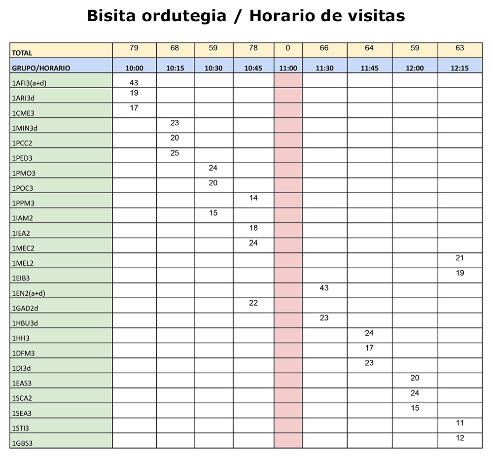 - Atxikita zeuen taldeari dagozkion bisita orduak daude. Edozein arazo izatekotan, edota talderen bat agertzen ez bada idatzi fol@fpbarakaldolh.eus emailera. LPO mintegitik, atxikitako dokumentuan agertzen diren bisita orduak errespetatzea eskatzen dizuegu eta 30 minutuko bisita egitea proposatzen dizuegu. Gure ustez, aukera aproposa da 1go mailako ikasleentzat, 2. kurtsoan aurkituko dutena ezagutzeko eta ekintzailetzarekin konektatzeko.